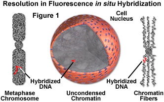 • FISH on Interphase Nuclei - A high-resolution map can be created by using the interphase nuclei as chromatin fibers extending into the nuclei because they stretch much more when compared to those in the metaphase chromosomes (see Figure 1). This procedure is can be used to map DNA clones at a resolution of 50-500 kilobase pairs, however its accuracy is somewhat reduced because the degree of extension of chromatin fibers varies.