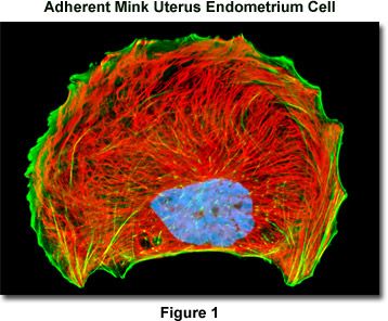 Presented in Figure 1 is a widefield fluorescence image revealing the vimentin intermediate filament and filamentous actin networks present in adherent mink uterus endometrium epithelial cells (GMMe line). The cells were immunofluorescently labeled with mouse anti-vimentin primary antibodies followed by goat anti-mouse secondary antibodies conjugated to Texas Red-X. In addition, the specimen was counterstained with phalloidin conjugated to Alexa Fluor 488 and DAPI, targeting the actin network and nuclei, respectively. Images were recorded in grayscale with a QImaging Retiga Fast-EXi camera system coupled to an Olympus BX-51 microscope equipped with bandpass emission fluorescence filter optical blocks provided by Omega Optical. During the processing stage, individual image channels were pseudocolored with RGB values corresponding to each of the fluorophore emission spectral profiles.