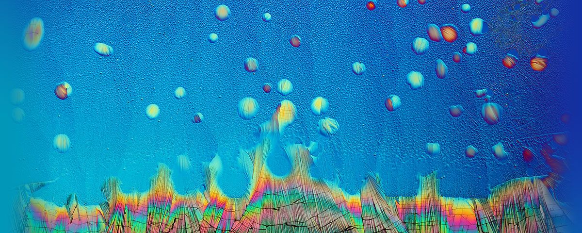 | Karl Gaff’s image of dopamine droplets on glass won second prize in the Olympus Image of the Year award 2018. Here he explains the optical effects and ingenious contrast methods that produce the spectacular colors from an otherwise translucent sample. |