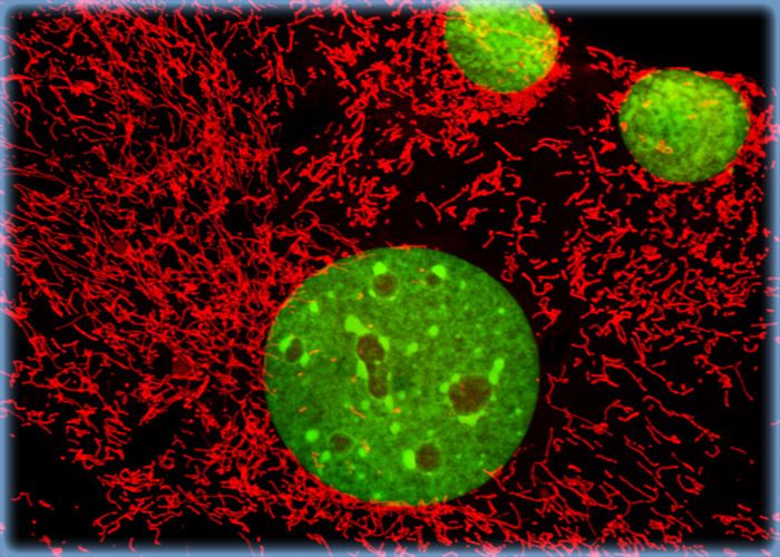A monolayer culture of Swiss mouse embryo cells was treated with MitoTracker Red CMXRos in medium containing 15 percent Cosmic calf serum, fixed with the same medium containing 3.7 percent paraformaldehyde, permeabilized with 0.2 percent Triton X-100, and then counterstained with SYTOX Green, targeting DNA in the nuclei.