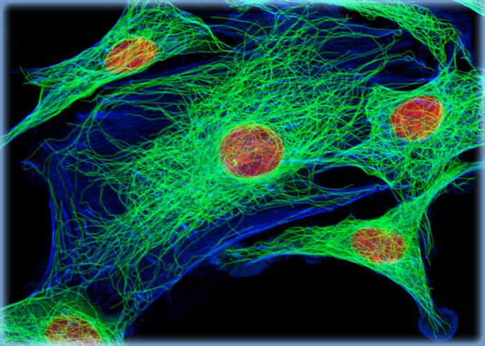 In order to visualize the microtubules present in the gerbil lung cells shown in this confocal image, a GeLu culture was immunofluorescently labeled with anti-tubulin mouse monoclonal primary antibodies followed by goat anti-mouse Fab fragments conjugated to Alexa Fluor 488. In addition, the cells were labeled for the cytoskeletal F-actin network with Alexa Fluor 546 (pseudocolored blue) conjugated to phalloidin, and for cell nuclei with TO-PRO-3.