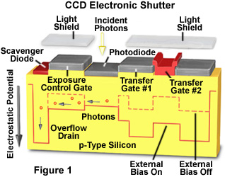 Presented in Figure 1 is a diagrammatic illustration of a CCD pixel that is equipped with an electronic shutter exposure control gate. The shutter is used to vary the integration time by draining all charge from a photodiode potential well for a fraction of the total integration time. Electronic shutters usually operate in stepped increments, decreasing the collected illumination (exposure time) by 50 percent for each step.