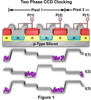 Charge transfer through CCD shift registers occurs after integration to relocate accumulated charge information to the sense amplifier, which is physically separated from the parallel pixel array. Several clocking schemes, including the two phase technique illustrated in Figure 1, are utilized to transfer charge from the collection gates to the output node.