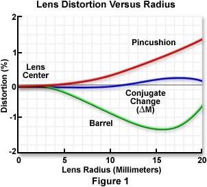 Distortion is an aberration commonly seen in stereoscopic microscopy, and is manifested by changes in the shape of an image rather than the sharpness or color spectrum. The two most prevalent types of distortion, positive and negative (often termed pincushion and barrel, respectively), can often be present in very sharp images that are otherwise corrected for spherical, chromatic, comatic, and astigmatic aberrations. In this case, the true geometry of an object is no longer maintained in the image.