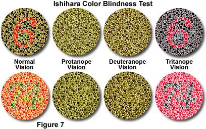 In spite of the limitations, there are some visual acuity advantages to color blindness, such as the increased ability to discriminate camouflaged objects. Outlines, rather than colors, are responsible for pattern recognition, and improvements in night vision may occur due to certain color vision deficiencies. In the military, colorblind snipers and spotters are highly valued for these reasons. During the early 1900s, in an effort to evaluate abnormal human color vision, the Nagel anomaloscope was developed. Utilizing this instrument, the observer manipulates control knobs to match two colored fields for color and brightness. Another evaluation method, the Ishihara pseudoisochromatic plate test for color blindness, named for Dr. Shinobu Ishihara, discriminates between normal color vision and red-green color blindness (as presented in the tutorial and Figure 7). A test subject with normal color vision can detect the hue difference between the figure and background. To an observer with red-green deficiency, the plates appear isochromatic with no discrimination between the figures and the design pattern.