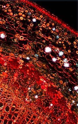 Stained specimens are often excellent candidates for darkfield microscopy, yielding beautiful images that are rendered in color on a dark background. The photomicrograph below illustrates a stained thin section of a basswood tree under darkfield illumination.
