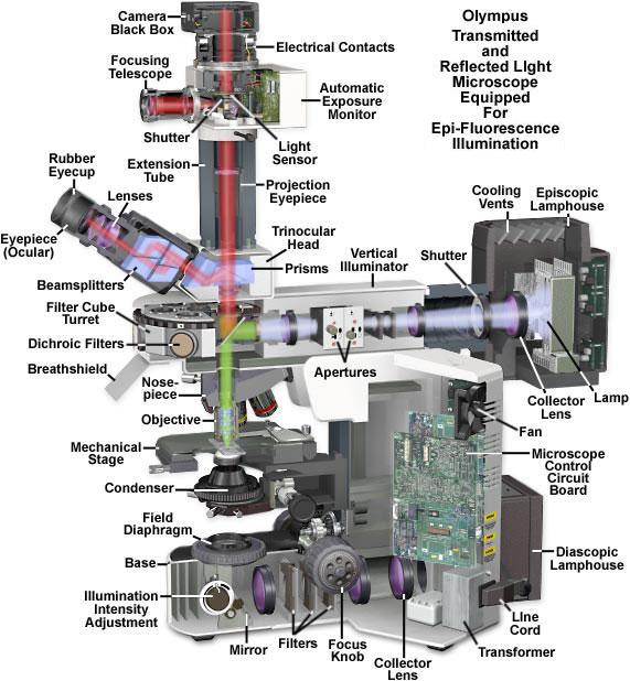 Microscopes with an upright-style frame are capable of producing fluorescence illumination either through episcopic or diascopic optical pathways, although the latter is rarely used today. Epi-illuminators usually consist of a mercury or xenon lamphouse coupled to a vertical illuminator that is positioned above the main frame in a separate assembly. The microscope nosepiece and transmitted light components (diascopic illuminator, condenser, field diaphragm, filters, etc.) are built into the main frame, while fluorescence components are housed in the vertical illuminator. These illuminators often contain a revolving or sliding turret that houses four to six "cubes" that contain a mixture of interference filters including a barrier filter, dichroic mirror, and an excitation filter. As illustrated above, light emitted from the lamp positioned in the episcopic lamphouse passes through a collector lens and then the field and aperture diaphragms before entering the first interference filter in the cube set, the emission filter. This light is then directed through the objective and onto the specimen by a special dichroic mirror that reflects certain wavelengths while passing others. Secondary fluorescence, emitted by fluorophores residing in the specimen, travels back through the objective and the dichroic mirror before passing through a barrier filter and into the microscope eyepieces or camera system.