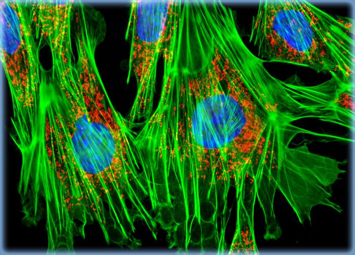 A log phase culture of embryonic Swiss mouse fibroblast cells was stained with MitoTracker Red CMXRos, Alexa Fluor 488 conjugated to phalloidin, and DAPI, which target the intracellular mitochondrial network, cytoskeletal actin filaments, and nuclei, respectively. High signal levels from all three of the fluorophores employed to stain the culture are present.