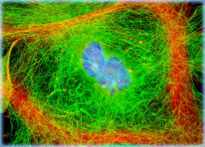 Alexa Fluor 568 conjugated to phalloidin, which targets cytoskeletal filamentous actin, and DAPI, which binds to DNA in cell nuclei, were used to probe a culture of Swiss mouse embryo fibroblast cells. In addition, the 3T3 cells were immunofluorescently labeled with primary anti-tubulin mouse monoclonal antibodies followed by goat anti-mouse Fab fragments conjugated to Cy2, targeting the microtubule network.