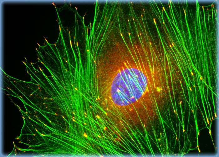An adherent culture of Swiss mouse embryo cells was immunofluorescently labeled with primary anti-vinculin mouse monoclonal antibodies followed by goat anti-mouse Fab heavy and light chain fragments conjugated to Cy3 (red emission). In addition, the specimen was simultaneously stained for DNA with the ultraviolet-absorbing probe Hoechst 33342, and for the cytoskeletal filamentous actin network with Alexa Fluor 488 conjugated to phalloidin.