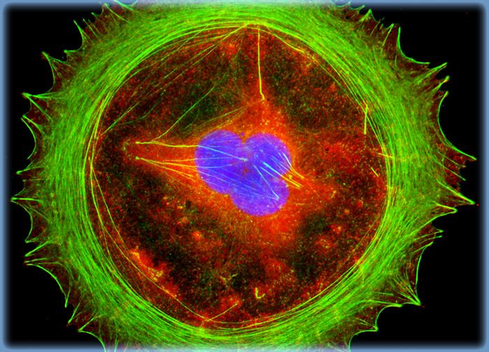 Log phase Swiss mouse embryo cells were immunofluorescently labeled with primary anti-beta-catenin rabbit monoclonal antibodies followed by goat anti-rabbit secondary antibodies conjugated to Rhodamine Red. In addition, nuclear histone proteins were targeted with anti-histone (pan) monoclonal antibodies, which were imaged with goat anti-mouse IgG (H + L) conjugated to Marina Blue (labeling the nucleus). The specimen was subsequently counterstained for the cytoskeletal filamentous actin network with Alexa Fluor 488 conjugated to phalloidin.