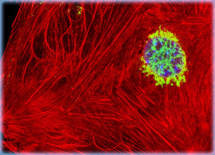 A semi-confluent culture of 3T3 cells was fixed, permeabilized, and blocked with 10-percent normal goat serum in phosphate-buffered saline prior to immunofluorescent labeling with primary antibodies to giantin, a protein resident in the Golgi complex of mammalian cells. The culture was subsequently stained with a mixture of secondary antibodies conjugated to Alexa Fluor 488 in a mixture containing phalloidin conjugated to Alexa Fluor 568. The cell nuclei were counterstained with Hoechst 33342.