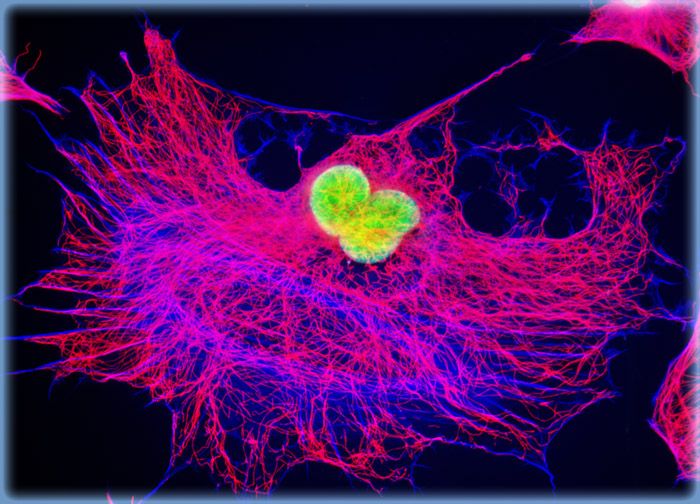A monolayer culture of Swiss mouse embryo cells was immunofluorescently labeled with primary mouse anti-beta-tubulin antibodies, and then subsequently treated with a mixture of secondary antibodies conjugated to Alexa Fluor 568 in a mixture containing phalloidin conjugated to Alexa Fluor 350. The cell nuclei were counterstained with SYTOX Green.