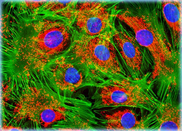A culture of 3T3 mouse embryo cells was triple-labeled with the standard protocol: MitoTracker Red CMXRos to target the mitochondria, Alexa Fluor 488 conjugated to phalloidin for the filamentous actin network, and Hoechst 33342 to stain DNA in the cell nuclei.