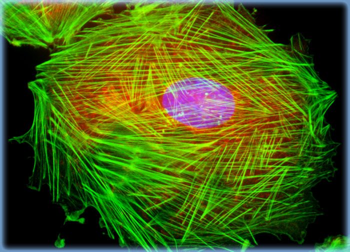 A culture of rat thoracic aorta (A-10) cells was labeled with the enzyme DNase I conjugated to the fluorochrome Texas Red in order to reveal unpolymerized globular (G) actin, which accumulates in the center of the cell. In addition, the specimen was simultaneously stained for DNA with the ultraviolet-absorbing probe DAPI, and for the cytoskeletal filamentous actin network with Alexa Fluor 488 conjugated to phalloidin.