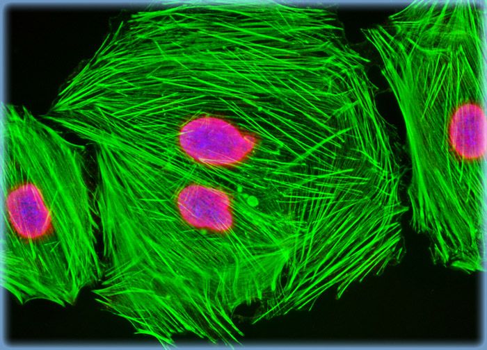 In order to label the intermediate filaments in a log phase adherent A-10 culture, the fixed and permeabilized cells were blocked and treated with mouse anti-vimentin (porcine eye lens) primary antibodies followed by goat anti-mouse secondary antibodies (IgG) conjugated to Texas Red-X. Filamentous actin was visualized with phalloidin conjugated to Oregon Green 488, while the nuclei were stained with Hoechst 33258.