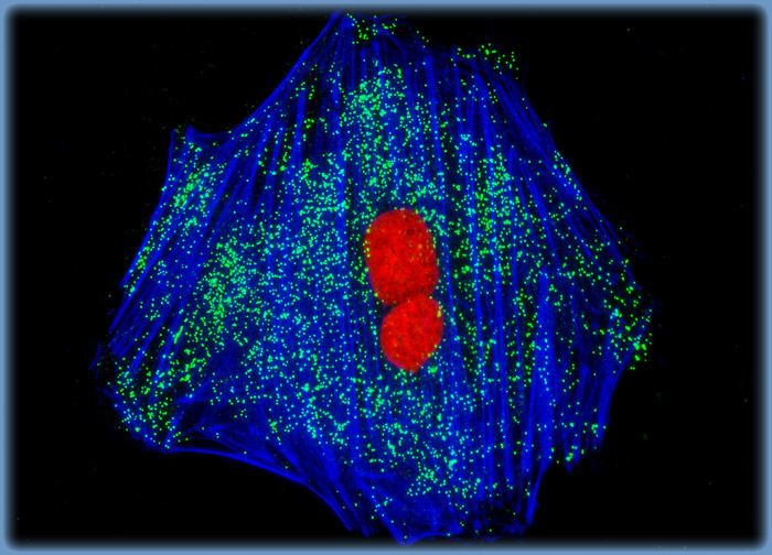 Using a popular fluorophore combination, a log phase monolayer culture of A-10 cells was treated with MitoTracker Red CMXRos for one hour, washed and fixed in growth medium containing paraformaldehyde, permeabilized, and blocked with bovine serum albumen. The culture was subsequently stained with Alexa Fluor 488 conjugated to phalloidin and counterstained with Hoechst 33258.