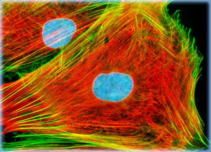 Focal adhesions were visualized in a log phase adherent monolayer culture of A-10 cells by immunofluorescent treatment with mouse anti-vinculin primary antibodies followed by goat anti-mouse Fab fragments conjugated to the cyanine dye, Cy2. The actin cytoskeletal network was simultaneously imaged with Alexa Fluor 568 conjugated to phalloidin, and nuclei were counterstained with Hoechst 33258.