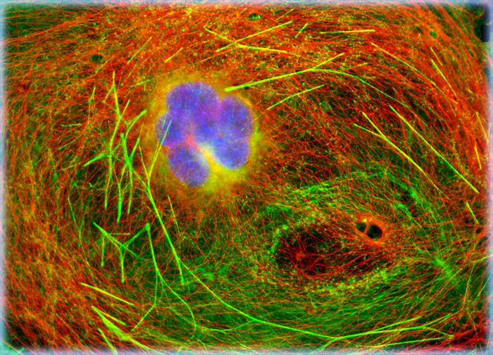 A culture of transformed African green monkey kidney cells was immunofluorescently labeled with primary anti-tubulin mouse monoclonal antibodies followed by goat anti-mouse Fab fragments conjugated to Cy3, targeting intracellular microtubules. The culture was also stained for DNA with DAPI, and for F-actin with Alexa Fluor 488 conjugated to phalloidin.