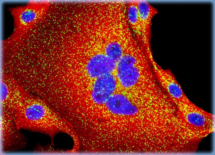 In this section, the featured culture of MDCK cells was immunofluorescently labeled with primary anti-clathrin (heavy chain) mouse monoclonal antibodies followed by goat anti-mouse Fab fragments conjugated to the cyanine dye Cy3 in order to target the cytoskeletal network. Additionally, peroxisomes present in the culture were immunofluorescently labeled with Cy2 conjugated to goat secondary antibodies directed against rabbit anti-PMP 70 (peroxisomal membrane protein 70) primary antibodies. Nuclei were counterstained with Hoechst 33342.
