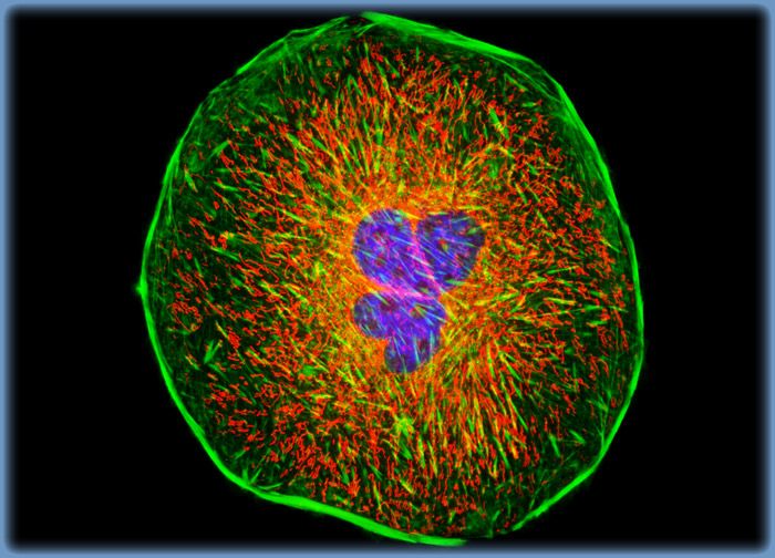 A log phase culture of Madin-Darby ovine kidney (MDOK) cells was treated with MitoTracker Red CMXRos, and then washed, and fixed with paraformaldehyde in medium containing serum. After several washes with phosphate-saline buffer, the cells were permeabilized and blocked with bovine serum albumen before labeling with Alexa Fluor 488 conjugated to phalloidin. The nuclei were subsequently counterstained with Hoechst 33258.