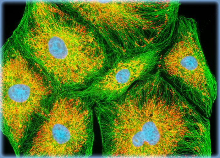 In order to visualize the interrelationship between the microtubule and mitochondrial networks in MDOK cells, a rapidly growing adherent culture was stained with MitoTracker Red CMXRos, fixed, permeabilized, and then treated with mouse primary antibodies to tubulin. The culture was subsequently labeled with goat anti-mouse Fab antibody fragments conjugated to fluorescein and counterstained with Hoechst 33258 (targeting DNA in the nucleus).