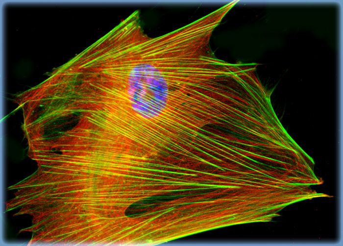 A culture of human lung fetal fibroblast cells was stained with Alexa Fluor 488 conjugated to phalloidin, which targets cytoskeletal filamentous actin, and Hoechst 33258, which binds to DNA in cell nuclei. The MRC-5 cells were also immunofluorescently labeled with anti-tubulin mouse monoclonal primary antibodies followed by goat anti-mouse Fab fragments conjugated to Cy3, targeting the intracellular microtubular network.