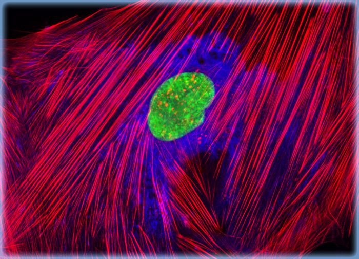 A culture of human fetal lung fibroblast cells was stained with Alexa Fluor 350 conjugated to the lectin concanavalin A, which selectively binds to alpha-mannopyranosyl and alpha-glucopyranosyl residues (primarily in the endoplasmic reticulum). Alexa Fluor 568 conjugated to phalloidin and SYTOX Green were also used to label the culture, targeting filamentous actin and nuclear DNA, respectively.