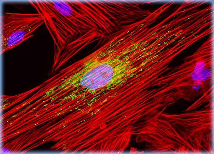 A culture of Indian Muntjac deer skin fibroblast cells was transfected with a pEYFP-Mitochondria (enhanced yellow fluorescent protein) chimeric plasmid subcellular localization vector. After fixation and permeabilization, the cells were labeled with Alexa Fluor 568 conjugated to phalloidin and DAPI, which target the F-actin cytoskeletal network and DNA in the cell nucleus, respectively.