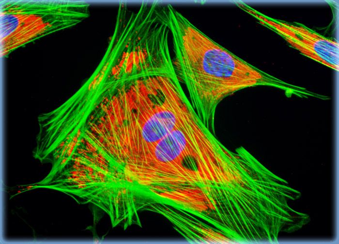 An adherent culture of Indian Muntjac deer skin fibroblasts was stained with Texas Red conjugated to the lectin concanavalin A, which selectively binds to alpha-mannopyranosyl and alpha-glucopyranosyl residues, primarily in the endoplasmic reticulum. Alexa Fluor 488 conjugated to phalloidin and DAPI were also used to counterstain the culture, targeting filamentous actin and nuclear DNA, respectively.