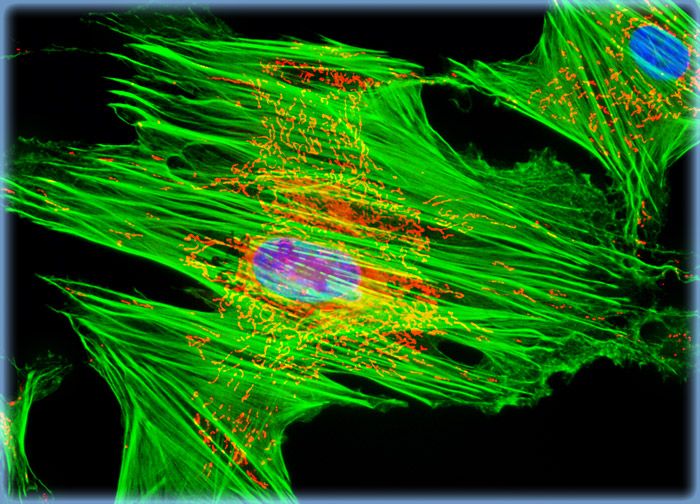 The mitochondrial network was targeted in a culture of NBL-6 horse fibroblasts with the X-rosamine derivative, MitoTracker Red CMXRos. The culture was simultaneously labeled for the cytoskeletal filamentous actin network and nuclear DNA with Alexa Fluor 488 conjugated to phalloidin and Hoechst 33258, respectively.