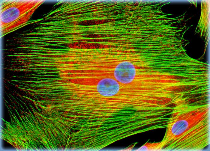 Calreticulin is a calcium-binding protein resident in the membrane of the endoplasmic reticulum. The adherent culture of horse fibroblasts featured in this section was immunofluorescently labeled with anti-calreticulin primary rabbit monoclonal antibodies followed by goat anti-rabbit secondary antibodies conjugated to Cy3. The cells were also stained with Alexa Fluor 488 conjugated to phalloidin and Hoechst 33342, which bind respectively with filamentous actin and DNA in the cell nucleus.