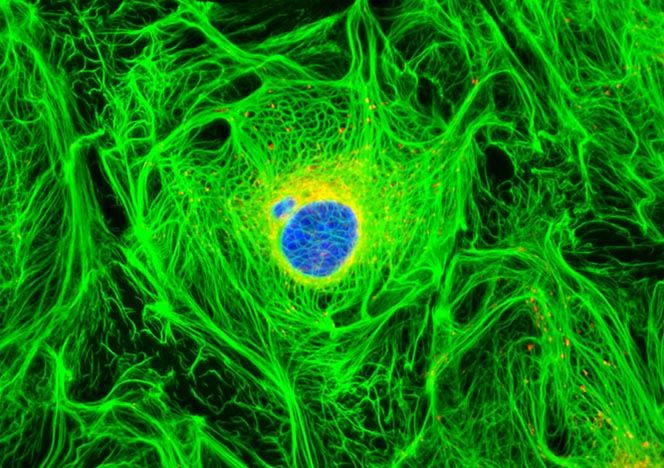 An adherent culture of male rat kangaroo kidney epithelial cells was immunofluorescently labeled with primary anti-cytokeratin (pan) mouse monoclonal antibodies followed by goat anti-mouse Fab fragments conjugated to the cyanine probe, Cy2. In addition, the cells were counterstained with MitoTracker Red CMXRos and DAPI, targeting the mitochondrial network and DNA, respectively.