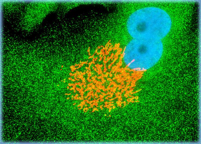 In a double immunofluorescence experiment, an adherent monolayer culture of African green monkey kidney cells was fixed, permeabilized, blocked with normal goat serum, and treated with a cocktail of mouse anti-clathrin (heavy chain) and rabbit anti-giantin (Golgi) primary antibodies, followed by goat anti-mouse and anti-rabbit secondary antibodies (IgG) conjugated to Alexa Fluor 488 and Alexa Fluor 568, respectively. The nuclei were counterstained with Hoechst 33258.