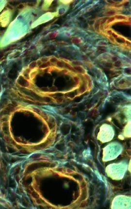 The tissue structure of raw meat is revealed in this fluorescence photomicrograph of a stained thin section of ground hamburger. As evidenced by this micrograph, combining fluorescence microscopy with classical histological staining techniques often yields enhancement of cellular features.