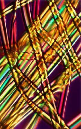Fibers of the synthetic polymer poly benzimidazole appear to resemble neon lights when illuminated with a combination of Hoffman modulated contrast and plane-polarized light with a first-order compensator in the light path.