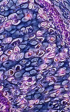 A stained thin section of bird skin (epidermis) is illustrated above. As evidenced by this micrograph, combining phase contrast microscopy with classical histological staining techniques often yields enhancement of cellular features.