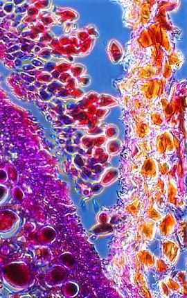 Cedar apple rust (CAR) is a disease affecting apple trees in North America east of the Rocky Mountains. It is caused by the fungus Gymnosporangium juniperi-virginianae and can defoliate trees and blemish fruit making them unmarketable. As evidenced by this micrograph, combining phase contrast microscopy with classical histological staining techniques often yields enhancement of cellular features.