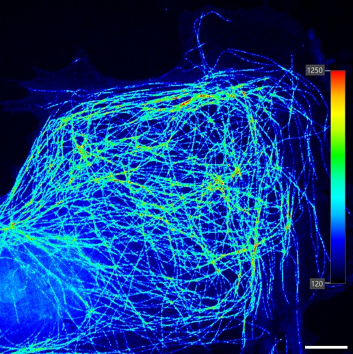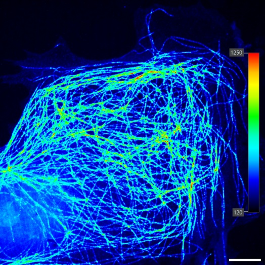 Cultured Cos-7 cells, Tubulin Alexa Fluor 488. Easily switch from a confocal image to a higher resolution image using the LUPLAPO25XS objective lens with the TruSight SR super-resolution algorithm. |