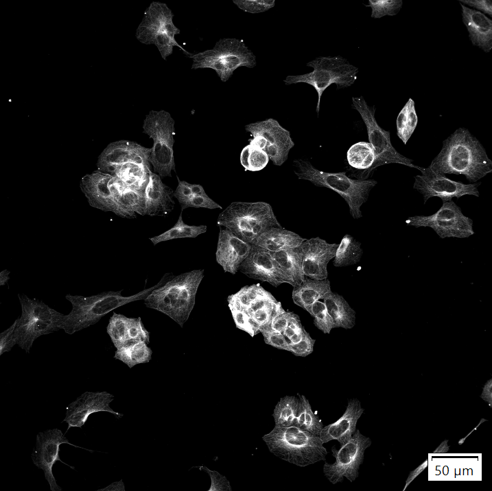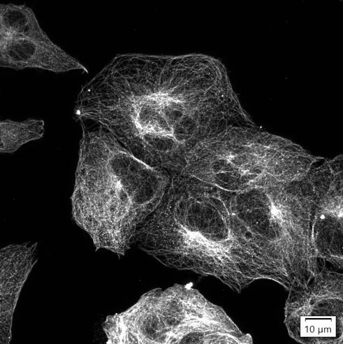 NIH3T3 cells labeled with Hoechst (blue), β-tubulin–AF555 (green), CPCA–HSP60–AF647 (magenta), and fibrillarin–AF568 (gray). Scale bar: 5 µm. Sample courtesy of EnCor Biotechnology Inc. |