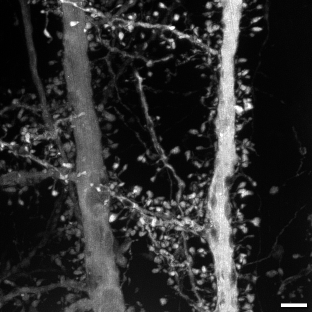 | µm maximum intensity projection of a mouse brain section, GFP. Scale bar 2 um. Sample courtesy of SunJin Lab Co., Taiwan. |