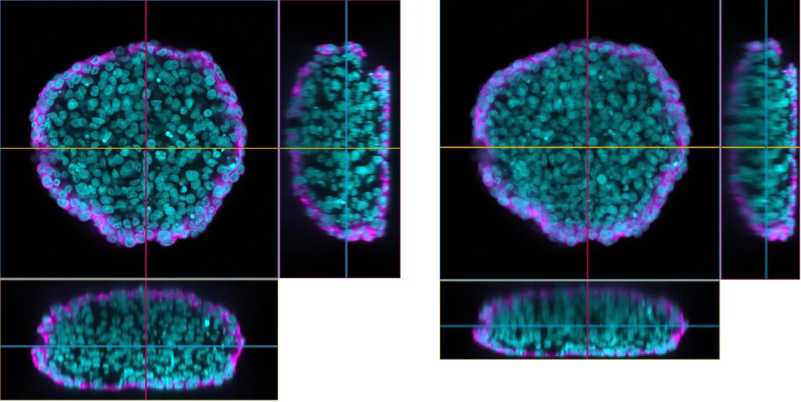 Expandable to Dual CamerasWith dual-camera imaging, you can capture multiple fluorescence channels at the same time—so you get more data, faster. Start with one camera and easily upgrade when you're ready. | Related VideosOrganoid. Phalloidin (magenta), E-cadherin (yellow). |