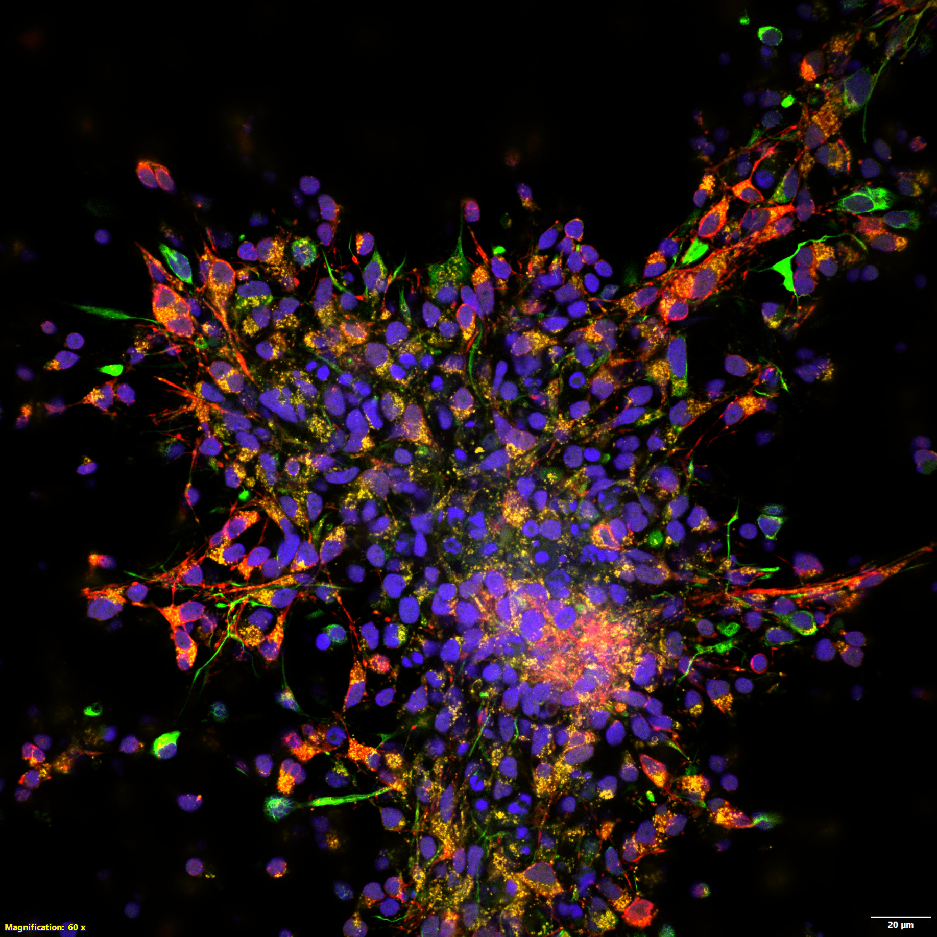 Adaptable by Design. Ready for Every Researcher.The IXplore IX85 SpinXL system can meet a wide range of applications, and its flexible, modular nature lets you expand as needs grow. Colors, More InformationExpansive multiplexing from 405 to 730 nm offers the flexibility to use the ideal wavelength for your fluorophores and image in up to seven channels, including in the NIR. Powered by the 89 North laser diode illuminator (LDI). | Neurons. DAPI (blue), ATP5 (yellow), vimentin (red), MAP2 (green). |