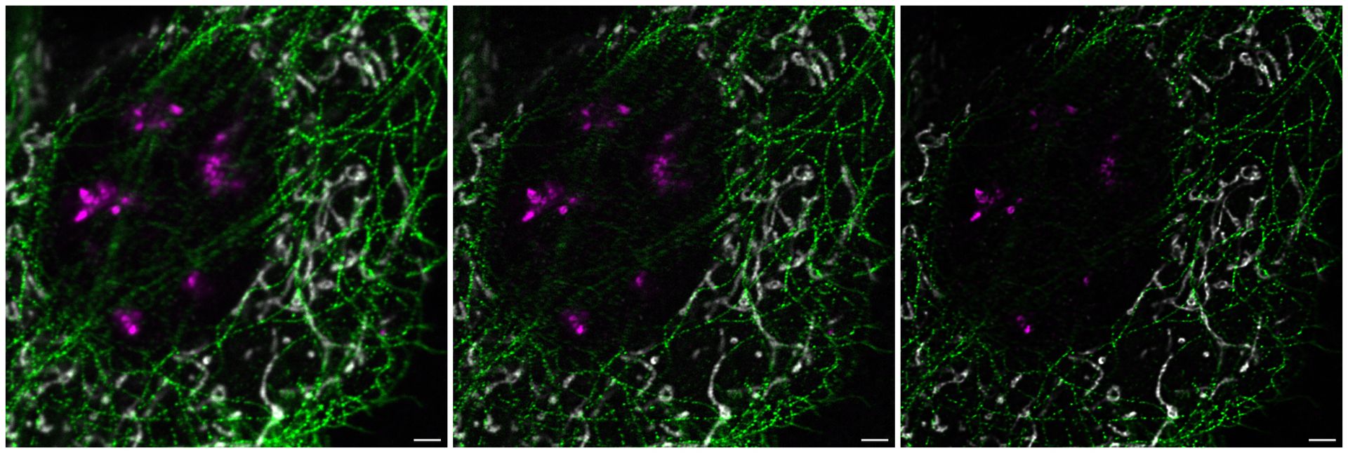 Figure 13. Cultured NIH 3T3 cells. Left: Original image. Middle: TruSight SR 3D processing (filter strength: 3.0). Right: TruSight deconvolution. Green: tubulin, Gray: HSP60, Magenta: fibrillarin. Sample provided by EnCor Biotechnology Inc. Captured using the IXplore IX85 SpinSR (SoRa disk, projection lens: 4X) with the UPLXAPO40XO (NA 1.4) objective. Scale bar: 2 µm.