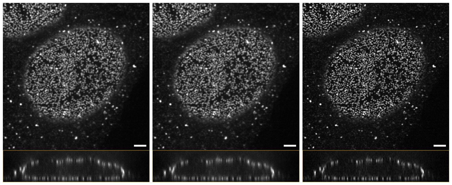 Figure 11. 3D imaging of nucleopores of HeLa* cells. Left: XY and XZ cross section of the original raw image captured by the IXplore IX85 SpinSR (SoRa disk, projection lens: 2.8X) using the UPLXAPO100XO (NA 1.45) objective. Middle: Left image was processed by TruSight SR 2D processing (filter strength 2.5). Right: Left image was processed by TruSight SR 3D processing (filter strength 2.5). Scale bar: 2 µm
