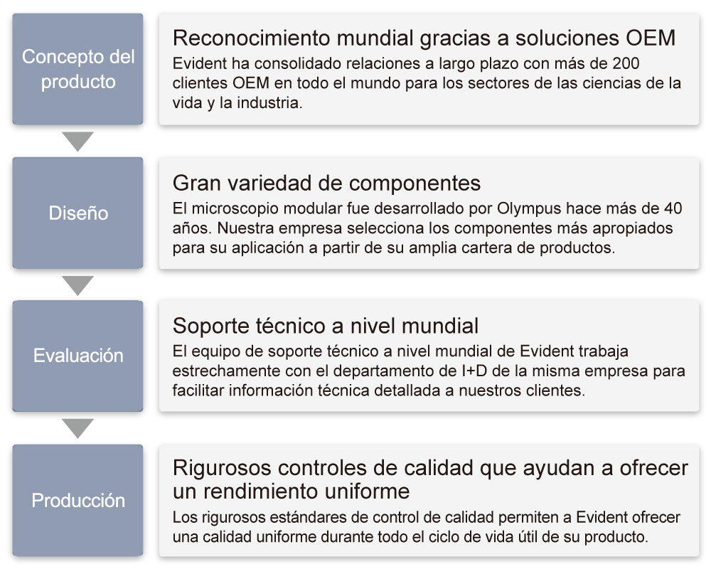 Gracias a la modularidad de los microscopios de Evident, cada uno de los componentes microscópicos puede ser integrado de forma separada en su producto para obtener máxima flexibilidad. |