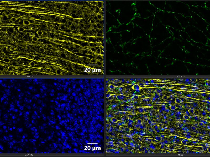 Des images d’échantillons épais d’une grande nettetéLa technologie permet une pénétration optique très profonde. Les tavelures (speckles) restant parfaitement focalisées même au plus profond des tissus, les capacités de sectionnement optique restent inchangées, quelle que soit la profondeur. | Related VideosVue d’ensemble acquise à un grossissement de 4x ; la vue du détail est une image à profondeur de champ étendue (EFI) d’une série Z de 19 µm acquise à un grossissement de 20x. Bleu : DAPI, Vert : GFAP (astrocytes), Jaune : IbaI (microglie). Rouge : NeuN (neurones). Échantillons fournis par l’Institute of Experimental Neuroregeneration, Spinal Cord Injury and Tissue Regeneration Center de Salzbourg (SCI-TReCS), Paracelsus Medical University, Autriche. |