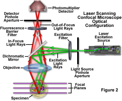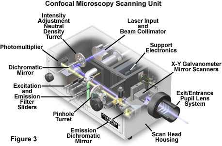 The significant amount of fluorescence emission that occurs at points above and below the objective focal plane is not confocal with the pinhole (termed Out-of-Focus Light Rays in Figure 2) and forms extended Airy disks in the aperture plane. Because only a small fraction of the out-of-focus fluorescence emission is delivered through the pinhole aperture, most of this extraneous light is not detected by the photomultiplier and does not contribute to the resulting image. The dichromatic mirror, barrier filter, and excitation filter perform similar functions to identical components in a widefield epi-fluorescence microscope. Refocusing the objective in a confocal microscope shifts the excitation and emission points on a specimen to a new plane that becomes confocal with the pinhole apertures of the light source and detector. In traditional widefield epi-fluorescence microscopy, the entire specimen is subjected to intense illumination from an incoherent mercury or xenon arc-discharge lamp, and the resulting image of secondary fluorescence emission can be viewed directly in the eyepieces or projected onto the surface of an electronic array detector or traditional film plane. In contrast to this simple concept, the mechanism of image formation in a confocal microscope is fundamentally different. As discussed above, the confocal fluorescence microscope consists of multiple laser excitation sources, a scan head with optical and electronic components, electronic detectors (usually photomultipliers), and a computer for acquisition, processing, analysis, and display of images. The scan head is at the heart of the confocal system and is responsible for rasterizing the excitation scans, as well as collecting the photon signals from the specimen that are required to assemble the final image. A typical scan head contains inputs from the external laser sources, fluorescence filter sets and dichromatic mirrors, a galvanometer-based raster scanning mirror system, variable pinhole apertures for generating the confocal image, and photomultiplier tube detectors tuned for different fluorescence wavelengths. The general arrangement of scan head components is presented in Figure 3 for a typical commercial unit.
