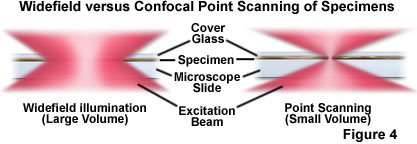 In epi-illumination scanning confocal microscopy, the laser light source and photomultiplier detectors are both separated from the specimen by the objective, which functions as a well-corrected condenser and objective combination. Internal fluorescence filter components (such as the excitation and barrier filters and the dichromatic mirrors) and neutral density filters are contained within the scanning unit (see Figure 3). Interference and neutral density filters are housed in rotating turrets or sliders that can be inserted into the light path by the operator. The excitation laser beam is connected to the scan unit with a fiber optic coupler followed by a beam expander that enables the thin laser beam wrist to completely fill the objective rear aperture (a critical requirement in confocal microscopy). Expanded laser light that passes through the microscope objective forms an intense diffraction-limited spot that is scanned by the coupled galvanometer mirrors in a raster pattern across the specimen plane (point scanning). One of the most important components of the scanning unit is the pinhole aperture, which acts as a spatial filter at the conjugate image plane positioned directly in front of the photomultiplier. Several apertures of varying diameter are usually contained on a rotating turret that enables the operator to adjust pinhole size (and optical section thickness). Secondary fluorescence collected by the objective is descanned by the same galvanometer mirrors that form the raster pattern, and then passes through a barrier filter before reaching the pinhole aperture. The aperture serves to exclude fluorescence signals from out-of-focus features positioned above and below the focal plane, which are instead projected onto the aperture as Airy disks having a diameter much larger than those forming the image. These oversized disks are spread over a comparatively large area so that only a small fraction of light originating in planes away from the focal point passes through the aperture. The pinhole aperture also serves to eliminate much of the stray light passing through the optical system. Coupling of aperture-limited point scanning to a pinhole spatial filter at the conjugate image plane is an essential feature of the confocal microscope. When contrasting the similarities and differences between widefield and confocal microscopes, it is often useful to compare the character and geometry of specimen illumination utilized for each of the techniques. Traditional widefield epi-fluorescence microscope objectives focus a wide cone of illumination over a large volume of the specimen, which is uniformly and simultaneously illuminated (as illustrated in Figure 4(a)). A majority of the fluorescence emission directed back towards the microscope is gathered by the objective (depending upon the numerical aperture) and projected into the eyepieces or detector. The result is a significant amount of signal due to emitted background light and autofluorescence originating from areas above and below the focal plane, which seriously reduces resolution and image contrast.