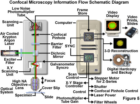 The laser illumination source in confocal microscopy is first expanded to fill the objective rear aperture, and then focused by the lens system to a very small spot at the focal plane (Figure 4(b)). The size of the illumination point ranges from approximately 0.25 to 0.8 micrometers in diameter (depending upon the objective numerical aperture) and 0.5 to 1.5 micrometers deep at the brightest intensity. Confocal spot size is determined by the microscope design, wavelength of incident laser light, objective characteristics, scanning unit settings, and the specimen. Presented in Figure 4 is a comparison between the typical illumination cones of a widefield (Figure 4(a)) and point scanning confocal (Figure 4(b)) microscope at the same numerical aperture. The entire depth of the specimen over a wide area is illuminated by the widefield microscope, while the sample is scanned with a finely focused spot of illumination that is centered in the focal plane in the confocal microscope. In laser scanning confocal microscopy, the image of an extended specimen is generated by scanning the focused beam across a defined area in a raster pattern controlled by two high-speed oscillating mirrors driven by galvanometer motors. One of the mirrors moves the beam from left to right along the x lateral axis, while the other translates the beam in the y direction. After each single scan along the x axis, the beam is rapidly transported back to the starting point and shifted along the y axis to begin a new scan in a process termed flyback. During the flyback operation, image information is not collected. In this manner, the area of interest on the specimen in a single focal plane is excited by laser illumination from the scanning unit. As each scan line passes along the specimen in the lateral focal plane, fluorescence emission is collected by the objective and passed back through the confocal optical system. The speed of the scanning mirrors is very slow relative to the speed of light, so the secondary emission follows a light path along the optical axis that is identical to the original excitation beam. Return of fluorescence emission through the galvanometer mirror system is referred to as descanning. After leaving the scanning mirrors, the fluorescence emission passes directly through the dichromatic mirror and is focused at the detector pinhole aperture. Unlike the raster scanning pattern of excitation light passing over the specimen, fluorescence emission remains in a steady position at the pinhole aperture, but fluctuates with respect to intensity over time as the illumination spot traverses the specimen producing variations in excitation. Fluorescence emission that is passed through the pinhole aperture is converted into an analog electrical signal having a continuously varying voltage (corresponding to intensity) by the photomultiplier. The analog signal is periodically sampled and converted into pixels by an analog-to-digital (A/D) converter housed in the scanning unit or the accompanying electronics cabinet. The image information is temporarily stored in an image frame buffer card in the computer and displayed on the monitor. It is important to note that the confocal image of a specimen is reconstructed, point by point, from emission photon signals by the photomultiplier and accompanying electronics, yet never exists as a real image that can be observed through the microscope eyepieces. Laser Scanning Confocal Microscope Configuration Basic microscope optical system characteristics have remained fundamentally unchanged for many decades due to engineering restrictions on objective design, the static properties of most specimens, and the fact that resolution is governed by the wavelength of light. However, fluorescent probes that are employed to add contrast to biological specimens and, and other technologies associated with optical microscopy techniques, have improved significantly. The explosive growth and development of the confocal approach is a direct result of a renaissance in optical microscopy that has been largely fueled by advances in modern optical and electronics technology. Among these are stable multi-wavelength laser systems that provide better coverage of the ultraviolet, visible, and near-infrared spectral regions, improved interference filters (including dichromatic mirrors, barrier, and excitation filters), sensitive low-noise wide band detectors, and far more powerful computers. The latter are now available with relatively low-cost memory arrays, image analysis software packages, high-resolution video displays, and high quality digital image printers. The flow of information through a modern confocal microscope is presented diagrammatically in Figure 5. Although many of these technologies have been developed independently for a variety of specifically-targeted applications, they have been gradually been incorporated into mainstream commercial confocal microscopy systems. In current microscope systems, classification of designs is based on the technology utilized to scan specimens. Scanning can be accomplished either by translating the stage in the x, y, and z directions while the laser illumination spot is held in a fixed position, or the beam itself can be raster-scanned across the specimen. Because three-dimensional translation of the stage is cumbersome and prone to vibration, most modern instruments employ some type of beam-scanning mechanism.